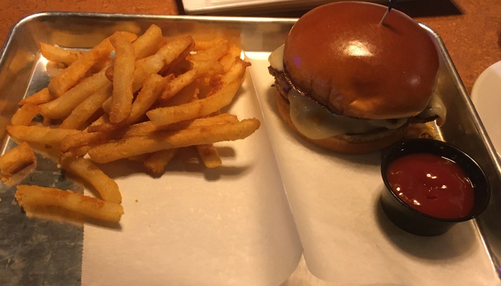 Just like the first time I went last year, the place had a small group of people there when we got there. The host and server were both welcoming and helpful in selecting appetizers, drinks, and entrees. We ordered the reuben egg rolls, black & bleu bacon burger, and jerk chicken sandwich. For drinks, I ordered an ABC Old Fashioned and she had a Blue Moon. The ABC Old Fashioned was not your typical Old Fashioned. It consisted of Bulleit Bourbon, chocolate bitters,orange juice, Luxardo cherries and orange zest. It was strong, but not over powering and was really good. I would have ordered another if I was not already super tired. Our appetizer was the reuben egg rolls, we weren’t really sure if we would like it or what it would look like but our server recommended them and so we decided to give it a try. It had the taste of a regular reuben but was inside these huge egg rolls and came with thousand island dipping sauce. It was soooooo good! It is something I would order again. The sandwiches we had were just as good. My guest seemed to have liked her burger. My jerk chicken sandwich was good, it had a little spice to it but the mango salsa provided a nice balance. My sandwich came with an order of fries, they were decent. I am not a huge fry fan.